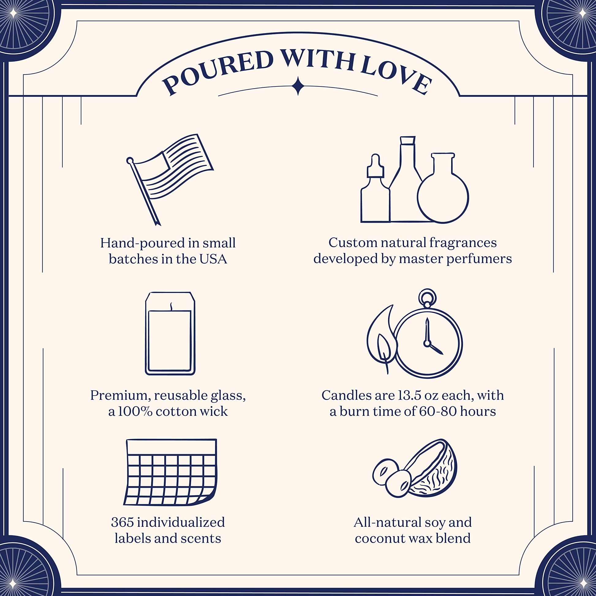 - Poured With Love: Birthdate Candles are crafted with an all-natural blend of soy, coconut, and apricot wax and custom natural fragrance oils. The vessel is a reusable and recyclable premium glass jar with a 100% cotton wick. Hand-poured in small batches in the Northeast USA.
